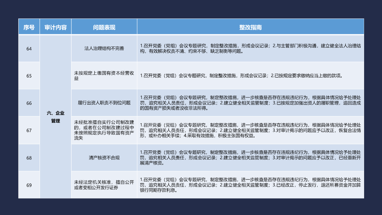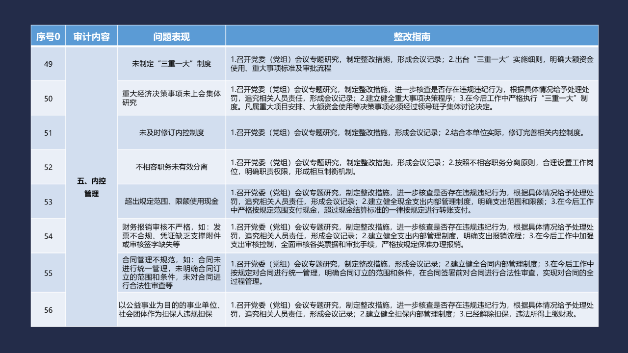 《整改指南100條》是在《江西省審計廳審計整改督查工作暫行辦法》(贛審綜發(fā)〔2021〕4號)第四章“審計整改認(rèn)定標(biāo)準(zhǔn)”有關(guān)規(guī)定的基礎(chǔ)上,結(jié)合審計整改工作實(shí)際,對常見審計查出問題的整改結(jié)果認(rèn)定標(biāo)準(zhǔn)進(jìn)行明確和細(xì)化。《整改指南100條》按照常見的重大政策措施落實(shí)、預(yù)算管理、政府采購及招投標(biāo)、基本建設(shè)、內(nèi)控管理、企業(yè)管理、自然資源、社保資金及安居工程、金融管理、國外貸援款共10類審計內(nèi)容進(jìn)行問題分類,列舉了100個常見問題并給出相對應(yīng)的整改標(biāo)準(zhǔn)說明,重點(diǎn)突出落實(shí)被審計單位整改主體責(zé)任、建立健全規(guī)章制度、推動問題全面整改等方面的內(nèi)容,審計機(jī)關(guān)和整改責(zé)任單位可以在審計整改工作中參照落實(shí)。